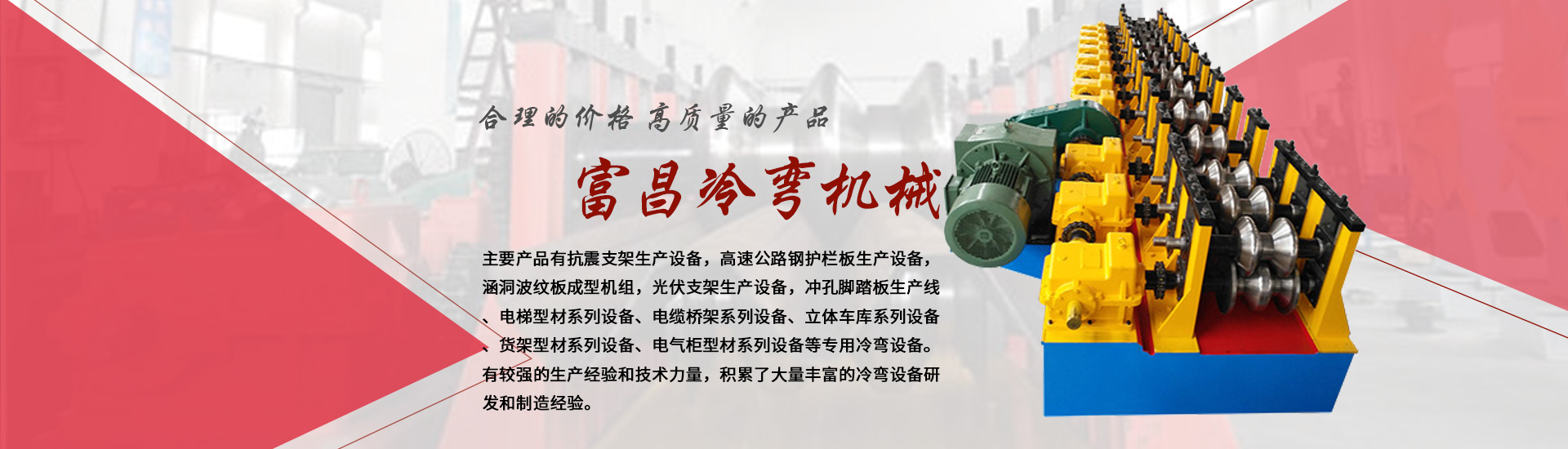 主要產(chǎn)品有抗震支架生產(chǎn)設備,高速公路鋼護欄板生產(chǎn)設備,涵洞波紋板成型機組,光伏支架生產(chǎn)設備,沖孔腳踏板生產(chǎn)線、電梯型材系列設備、電纜橋架系列設備、立體車庫系列設備、貨架型材系列設備、電氣柜型材系列設備等專用冷彎設備。有較強的生產(chǎn)經(jīng)驗和技術(shù)力量,積累了大量豐富的冷彎設備研發(fā)和制造經(jīng)驗。